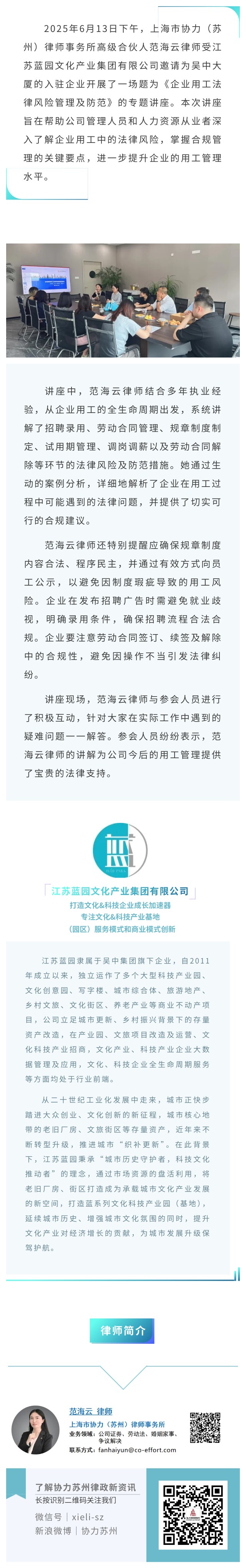 协力资讯丨范海云律师受江苏蓝园集团邀请为吴中大厦的入驻企业作《企业用工法律风险管理及防范》专题讲座