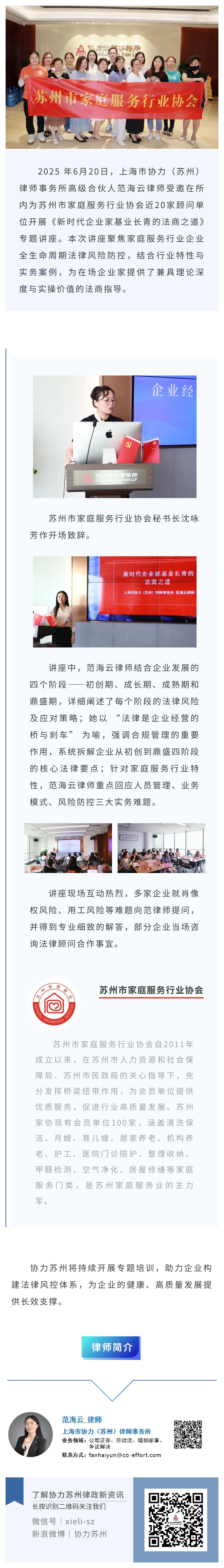 协力资讯丨范海云律师受邀为苏州市家庭服务行业协会顾问单位作《新时代企业家基业长青的法商之道》专题讲座